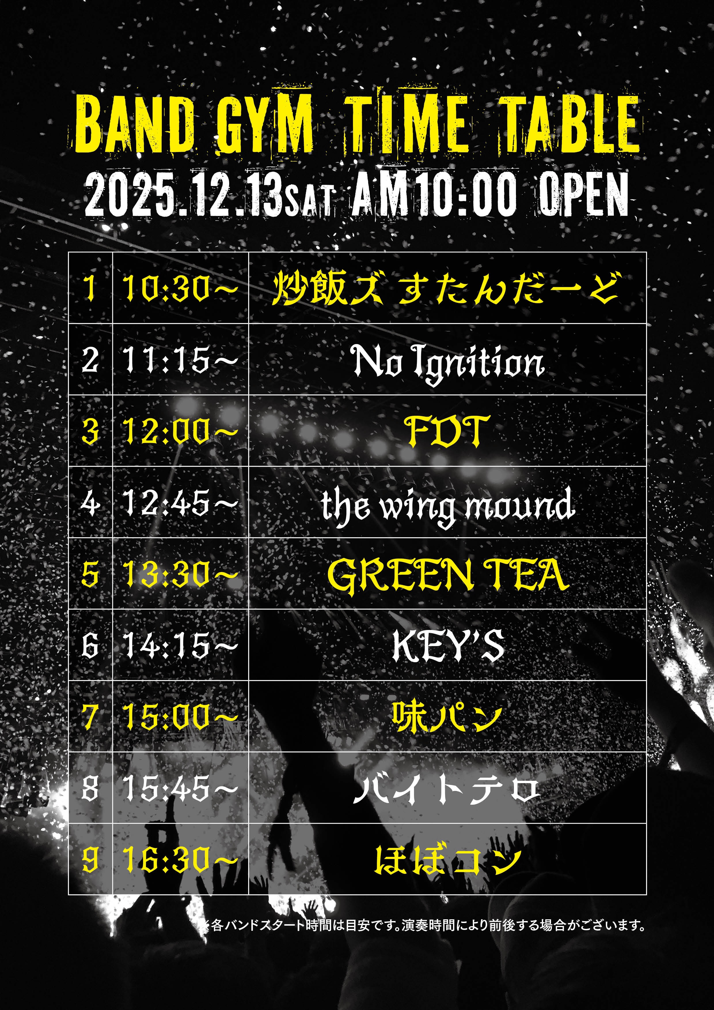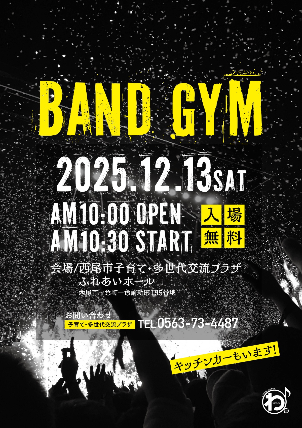 2025年12月13日(土) 子育て・多世代交流プラザ BAND GYM 多彩なバンドの熱いパフォーマンスをお楽しみください! キッチンカーも出店しております!! 【お問い合わせ先】 子育て・多世代交流プラザ TEL0563-73-4487 時 間 AM10:30〜[開場AM10:00] 場 所 子育て・多世代交流プラザ ふれあいホール 対 象 どなたでも 料 金 入場無料