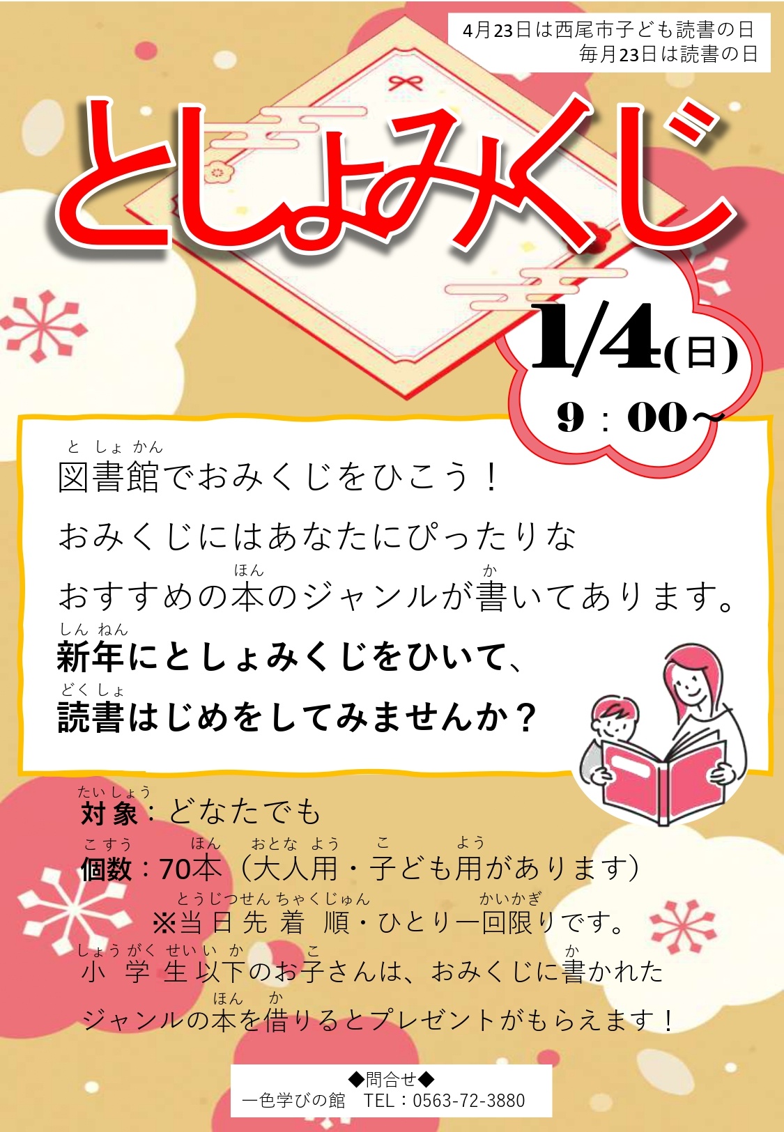 2026年1月4日(土) 一色学びの館 としょみくじ おすすめ本のジャンルが書かれたおみくじをひいて、図書館で読書はじめをしましょう! 【お問い合わせ先】 一色学びの館 TEL0563-72-3880 時 間 AM9:00~PM7:00 場 所 一色学びの館 1Fロビー 定 員 70本のおみくじをご用意いたします。(大人用と子ども用があります) 対 象 どなたでも 申 込 不要