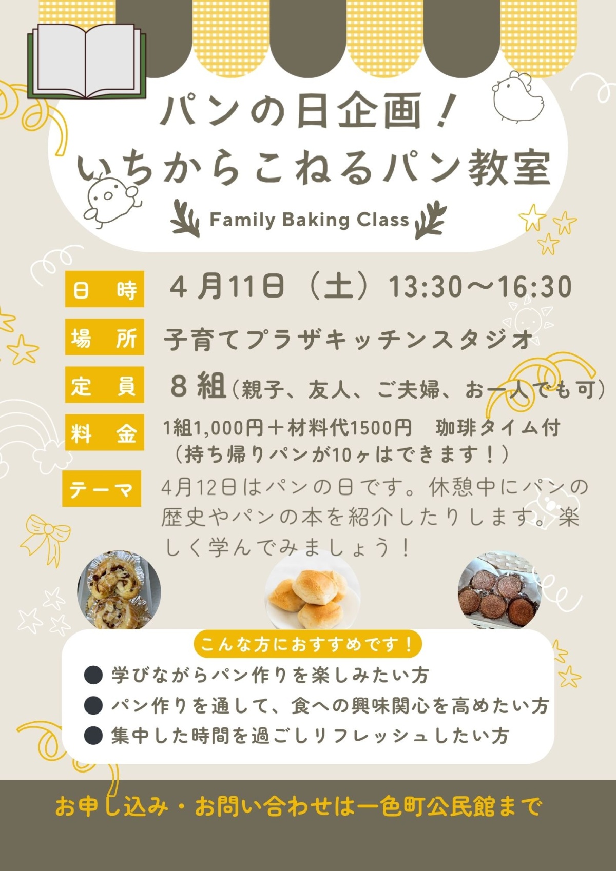 2026年4月11日(土) 一色町公民館 パンの日企画! いちからこねるパン教室 4月12日はパンの日です。休憩中にパンの歴史やパンの本を紹介したりします。楽しく学んでみましょう! 【お申し込み・問い合わせ先】 一色町公民館 TEL0563-72-3411 時 間 PM1:30〜4:30 場 所 子育て・多世代交流プラザ キッチンスタジオ 定 員 8組(親子・友人・ご夫婦・お一人でも可) 対 象 どなたでも 料 金 2,500円(珈琲タイム付)