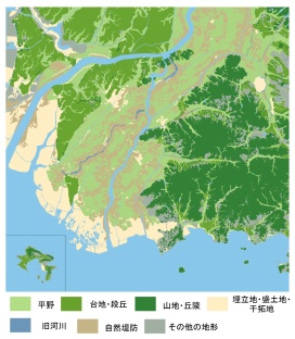 西三河低地は、美濃三河高原と碧海台地の間に広く分布している低地で、川や海の働きによって形成されました。主に固まっていない泥や砂、石などで形成されたやわらかい地盤で、地震に弱い傾向があります。