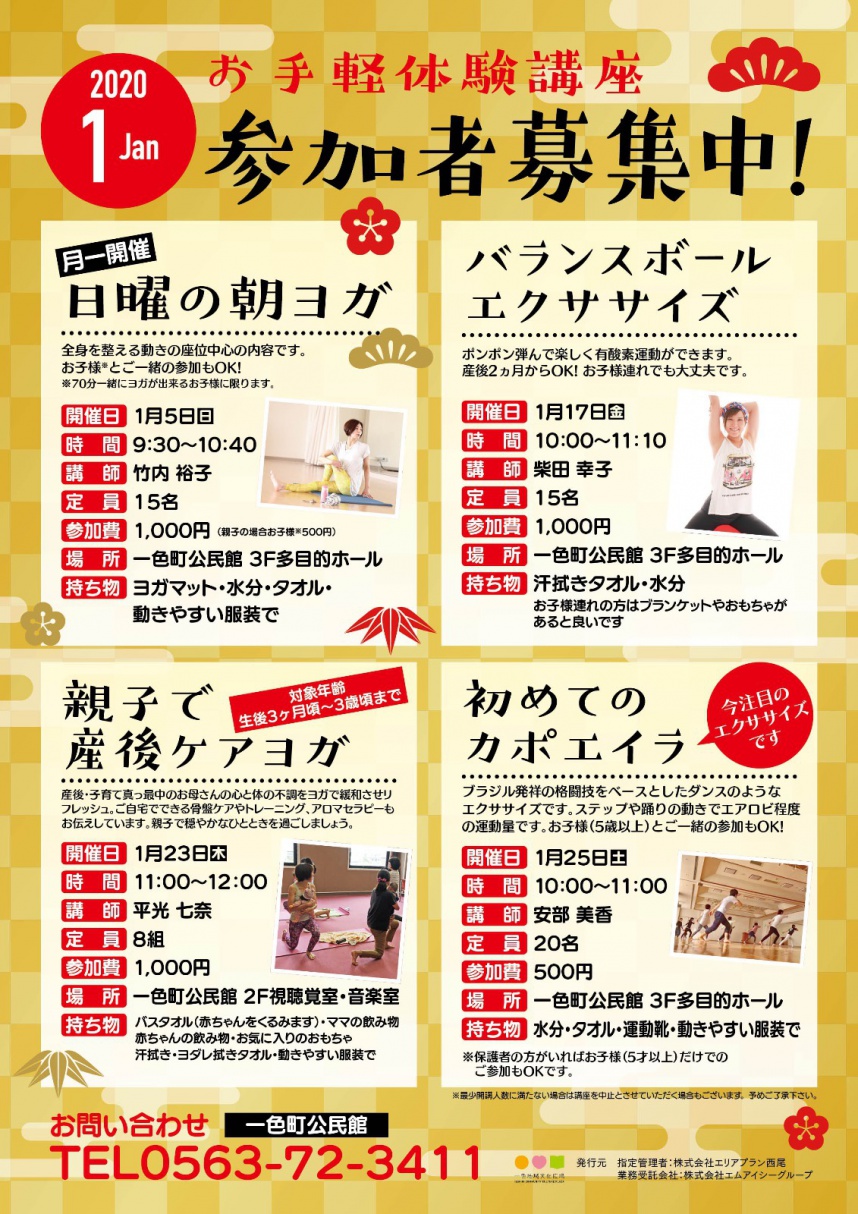 2019年12月24日(火) お知らせ 1月の体験講座開講のお知らせ 1月の体験講座生徒募集中 気になる講座がありましたらお気軽にご参加下さい。 お申し込み・お問い合わせは 一色町公民館 TEL0563-72-3411