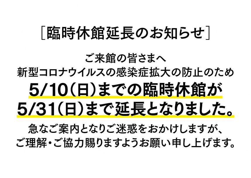 2020年04月30日(木) お知らせ 臨時休館延長のお知らせ 臨時休館延長のお知らせ 新型コロナウイルスの感染症拡大の防止のため5/10(日)までの臨時休館が5/31(日)まで延長となりました。 急なご案内となりご迷惑をおかけしますが、ご理解・ご協力賜りますようお願い申し上げます。