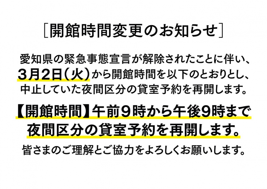 2021年02月28日(日) お知らせ 開館時間変更のお知らせ 開館時間変更のお知らせ 愛知県の緊急事態宣言が解除されたことに伴い、 3月2日(火)から開館時間を以下のとおりとし、 中止していた夜間区分の貸室予約を再開します。 【開館時間】午前9時から午後9時まで 夜間区分の貸室予約を再開します。 皆さまのご理解とご協力をよろしくお願いします。