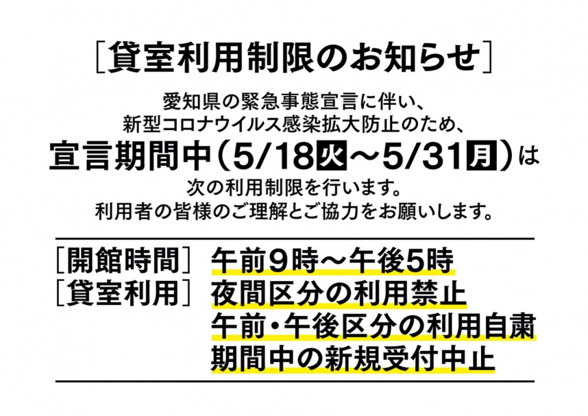 令和3年5月18日火曜日から当面の間、閉館時間を午後5時までに変更します。ただし、予約資料(本等)は、本館と一色学びの館は午後7時、吉良図書館と幡豆図書館は午後6時まで貸出します。