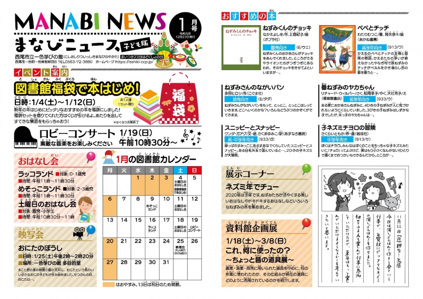 2020年01月05日(日) 一色学びの館 MANABIニュース1月号発行しました MANABIニュース1月号発行しました 楽しいイベント盛りだくさん。 皆様お誘い合わせの上ご来館ください。お待ちしております。