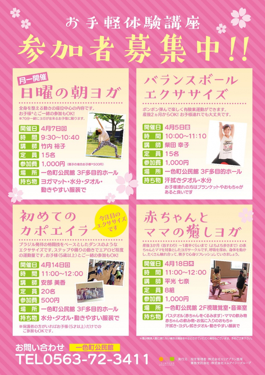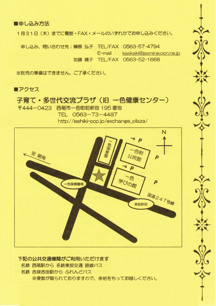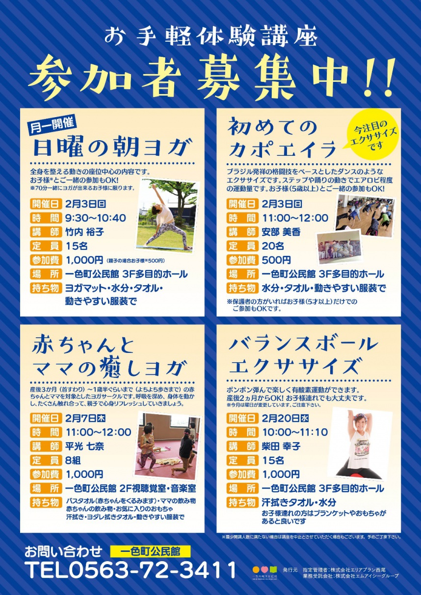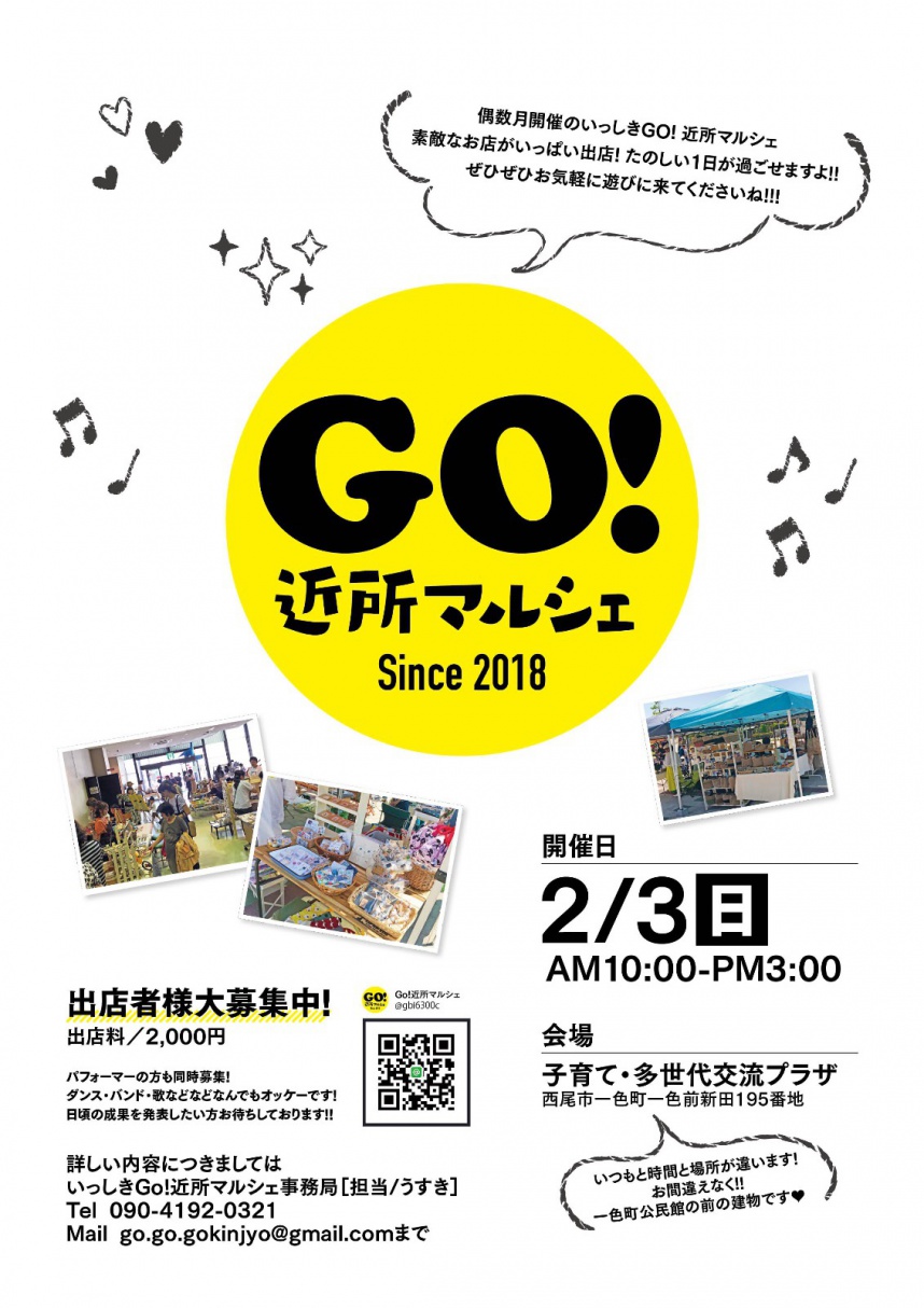2019年01月15日(火) お知らせ いっしきGo!近所マルシェ いっしきGo!近所マルシェ いっしきGo!近所マルシェ2/3(日)開催です。 今回は子育てプラザで午前10:00よりスタートです。 寒い時期ですが室内での開催ですので 皆様お気軽にお越し下さい。お待ちしております。