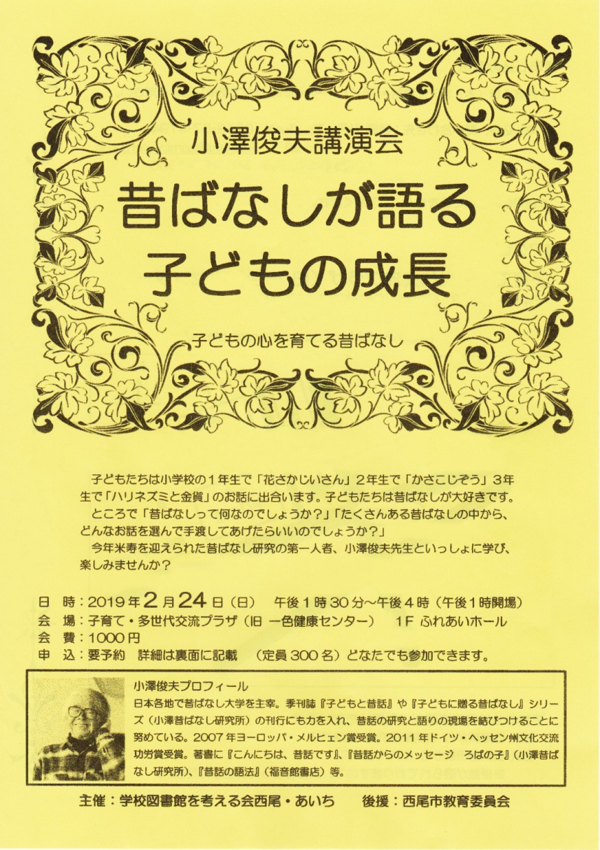 2019年01月15日(火) 子育て・多世代交流プラザ 「昔ばなしが語る子どもの成長」小澤俊夫講演会 「昔ばなしが語る子どもの成長」小澤俊夫講演会 来月2/24(日)子育て・多世代交流プラザ ふれあいホールにて開催されます。 昔ばなし研究の第一人者、小澤俊夫先生の講演会です。 先生といっしょに学び、楽しみませんか? 1月31日(木)が申し込み締め切りとなっております。