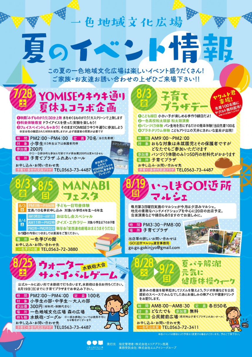 2018年07月17日(火) お知らせ 一色地域文化広場 夏のイベント情報 一色地域文化広場 夏のイベント情報 この夏の一色地域文化広場は楽しいイベント盛りだくさん! ご家族・お友達お誘い合わせの上ぜひご来場下さい!!
